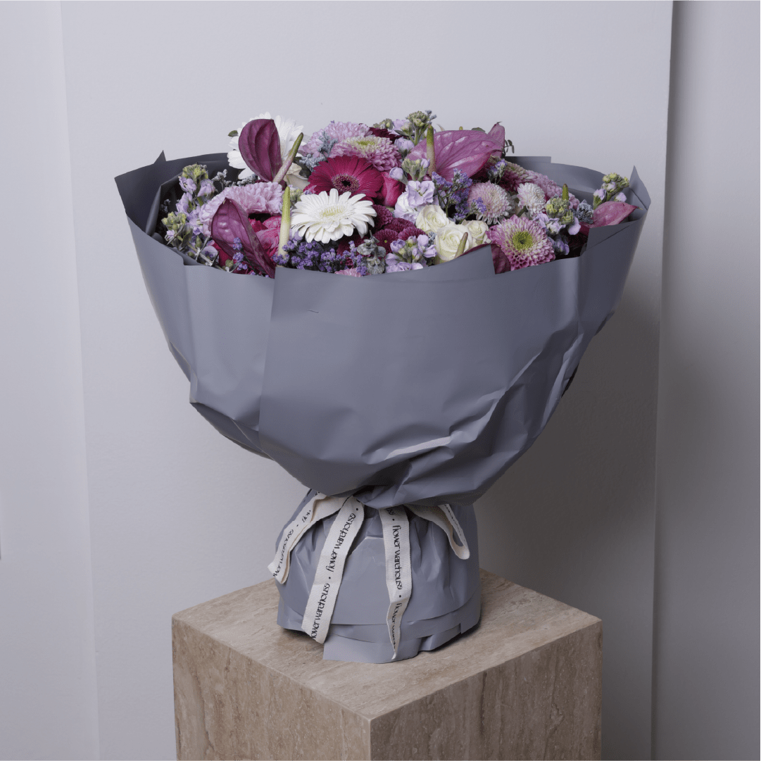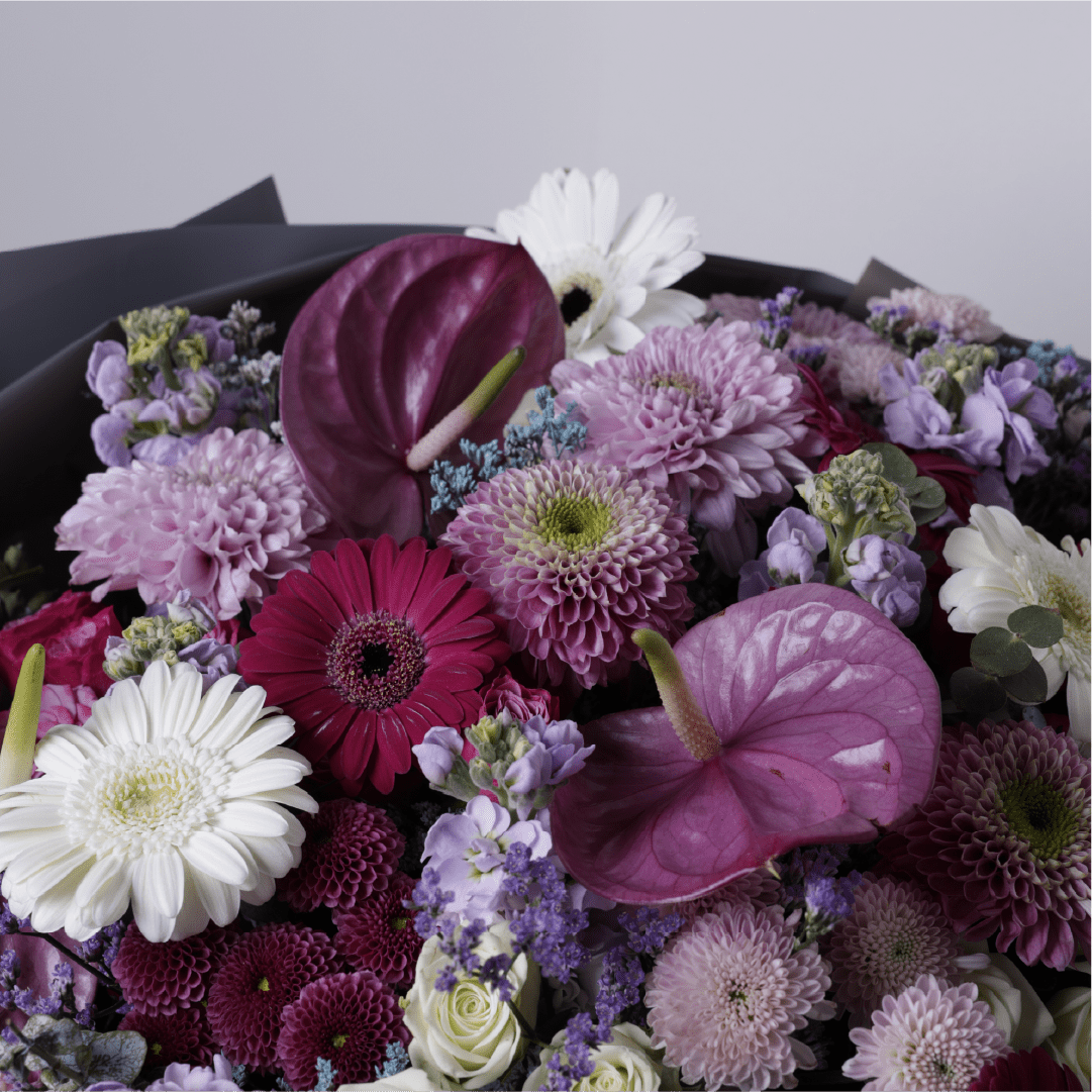 A bold yet elegant arrangement in shades of violet and berry. A striking summer bouquet that blends, softness with character. Perfect for standout gifts and special moments.